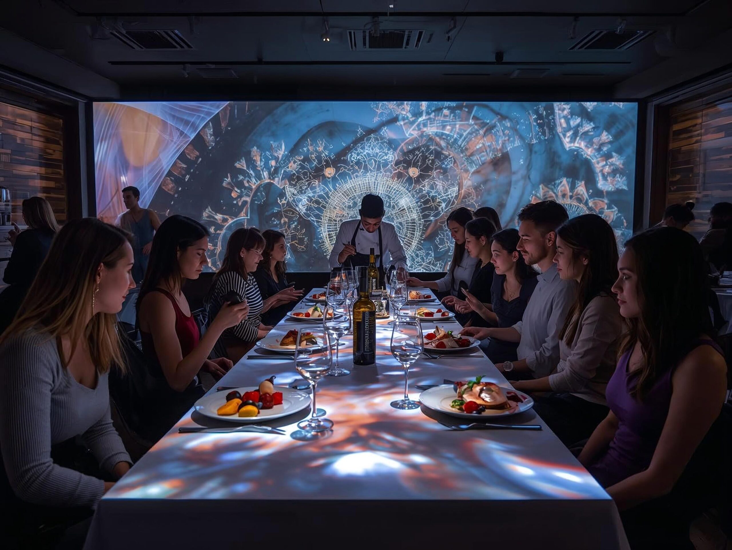 Projeções mapeadas, som 3D, realidade aumentada e até mesas interativas permitem que o jantar se transforme em uma experiência completa.